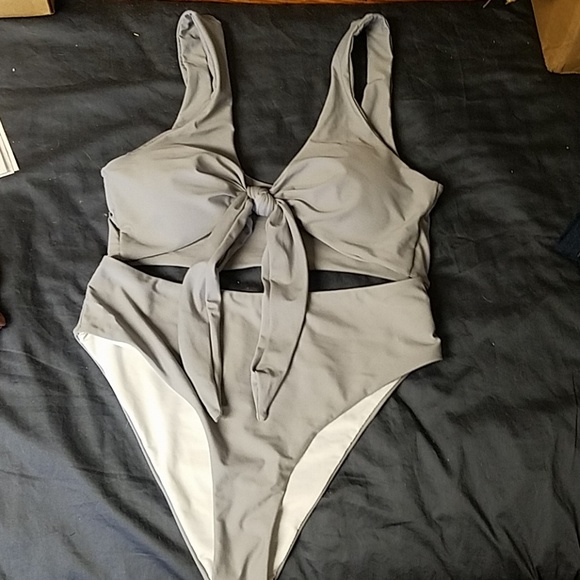 Light grey tie front bikini top with high rise cheeky bottoms.
