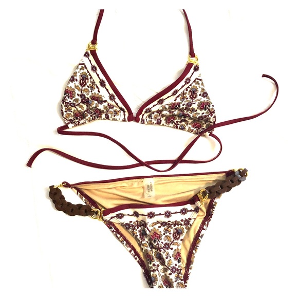 Top is small and bottoms are XS. Beautiful pattern with gold and faux leather accents. Has slots for removable cups but they are not included.