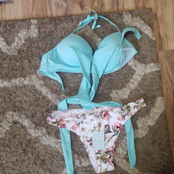 Blue bikini with tie top.