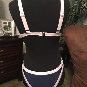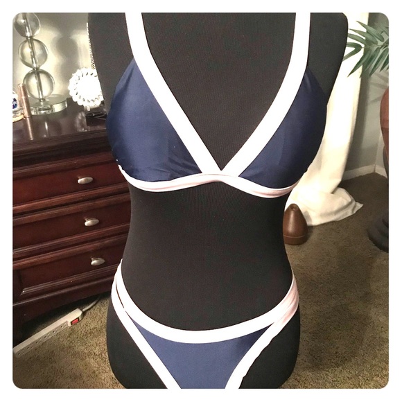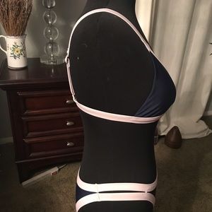 Brand new. Never worn with tags. Ordered online for $35. It did not fit me. Navy blue and white trim.
