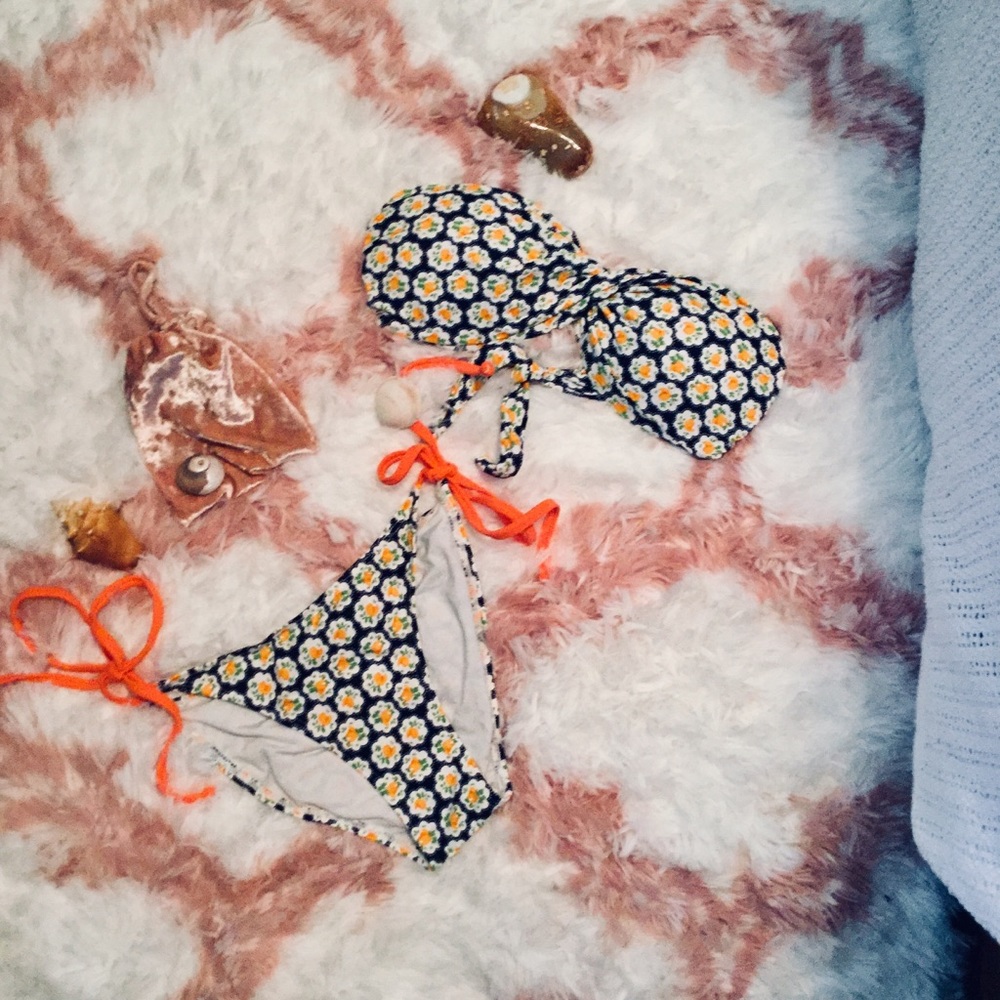 A black bikini set with white & orange flower designs all over with orange drawstrings and ties. Worn only once.