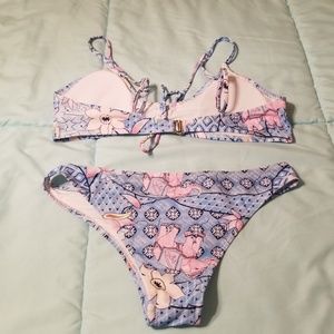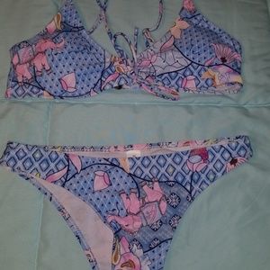Light blue with pink elephants on it. VERY cute but VERY SMALL. Never worn Looks like a very cheeky bottom.