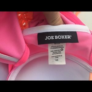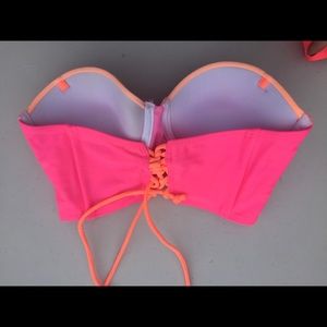 Lightly worn bikini. Corset/bra style bikini top from joe boxer (size small). Cheeky style coral bikini bottom with 3 straps on both sides from Damsed (size small). Coral/Pink/Orange accents.