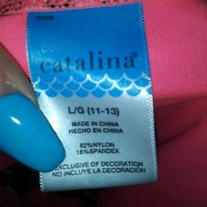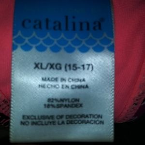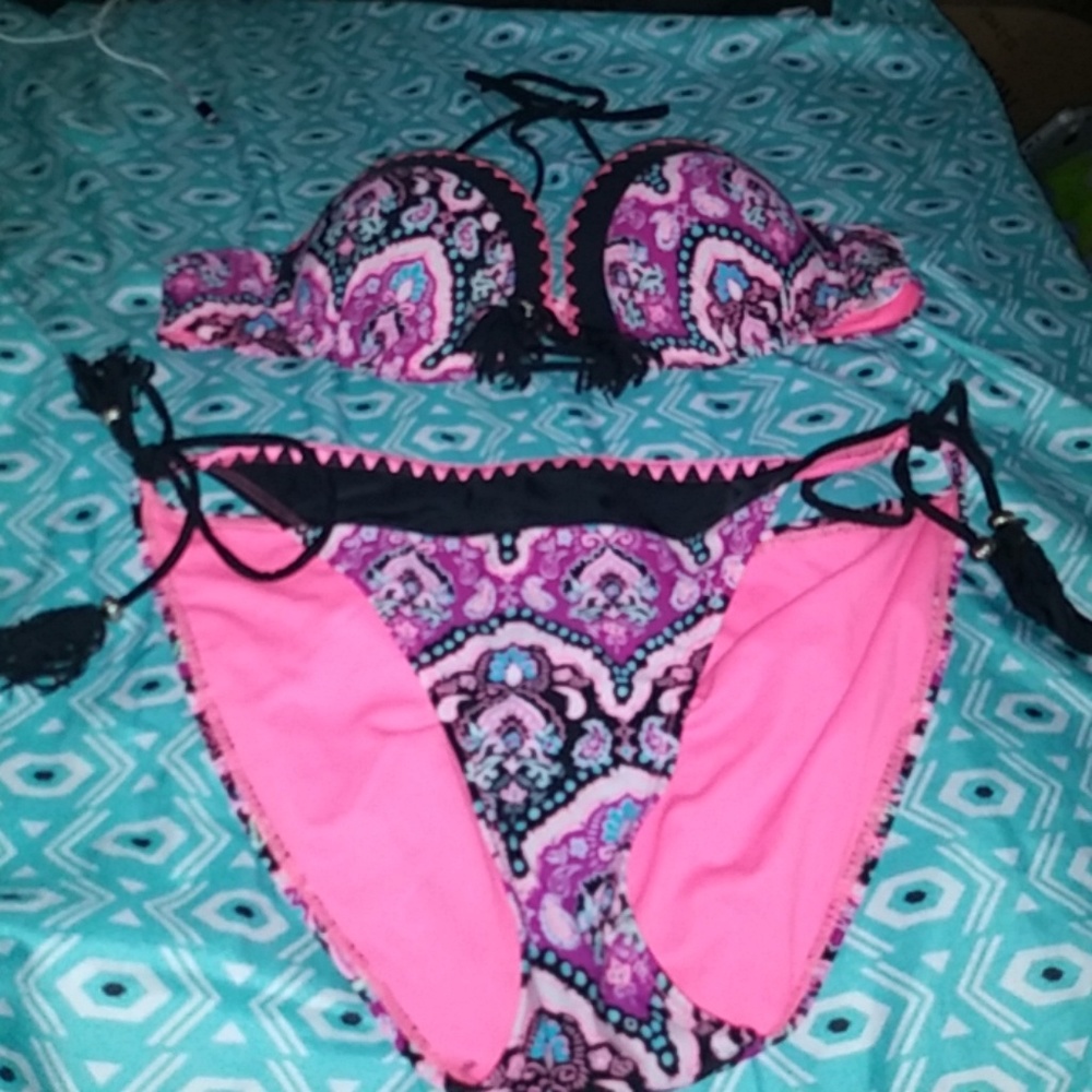 The top is an XL and the bottoms are a large the bottoms are tie string. They are in good condition