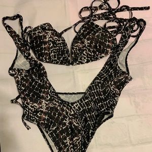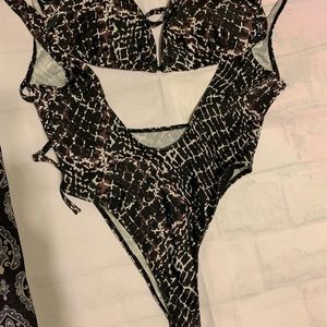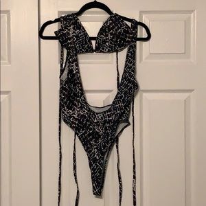 This is a brand new two piece bikini that ties around the neck and waist and the bottom piece goes on your shoulders. This has never been worn. I bought it and did not like the color when it came