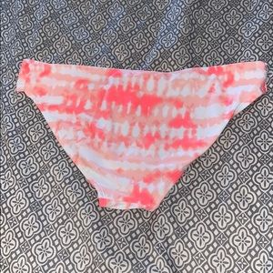It’s pink and white and only wore a couple of times it can tie in the front on the top and is a great swim suit the top is a small and the bottoms are a medium