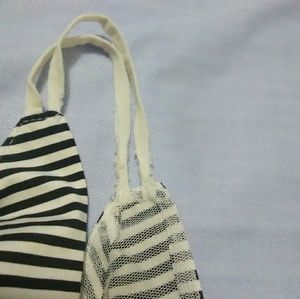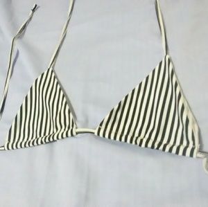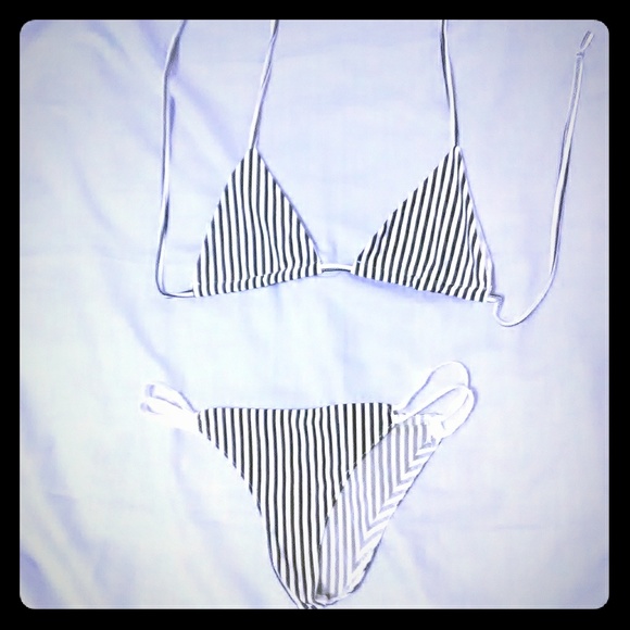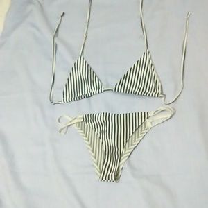 bundle 2 or more and I will offer an awesome deal! Hurry, sale won't last long!! sexy striped off-white and black string bikini. It is polyester, not stretchy like most. Looks amazing on. There is a little damage on the hip from getting stuck on velcro (refer to picture)