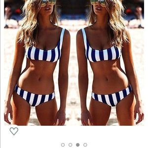 Navy blue and white stripes. Runs small! This is a medium but fits like a small or x-small