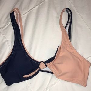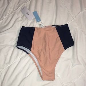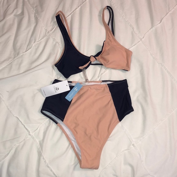 This bathing suit has never been worn & is in perfect condition! It is very comfortable & fashionable! The top has a cute tie twist & the bottoms are high waisted! The colors are navy blue & a light peach!