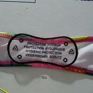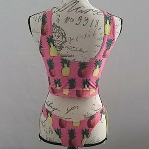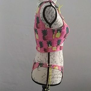 New never been worn half top halter bikini. Yellow tie strings in middle of halter top and on sides of bottoms. Pink with colorful red and yellow pineapples. Hygiene liner attached.