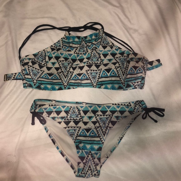 Light blue, dark blue, black, and white two piece bikini. Black straps. Bottoms are tied on the sides. Fits very well