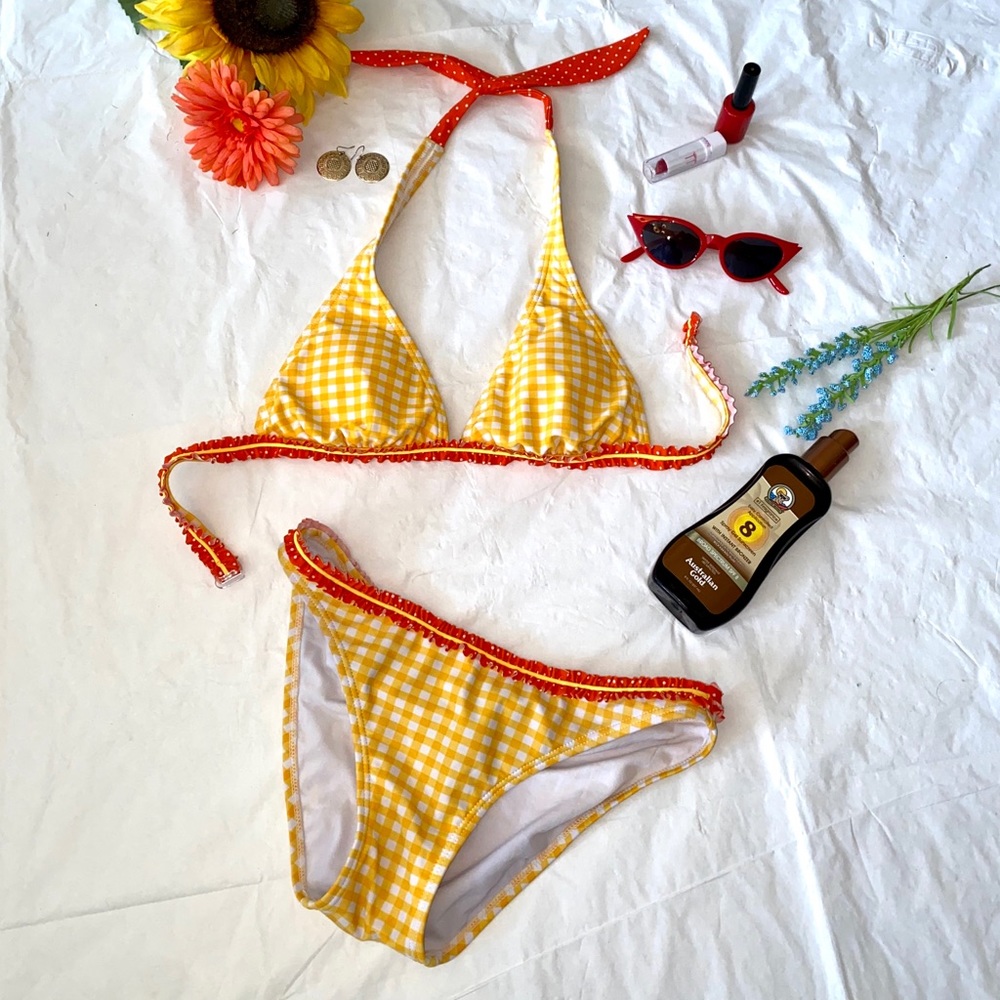 Yellow gingham bikini with orange ruffle trim. The orange raffle has tiny white dots. Back bra clasp closure, neck tie, triangle top.