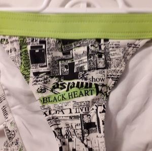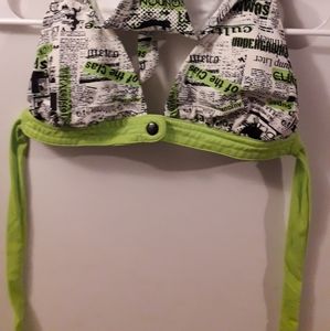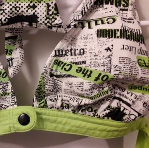 Newspaper headline print, with neon green trim. Worn once. Been in storage for a few years.