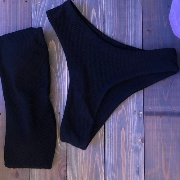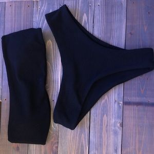 Strapless bandeau bikini with high leg cheeky bottoms! Super comfortable material