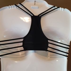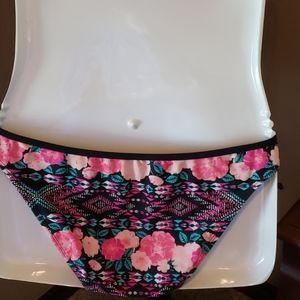 Pink, black, and blue bikini has racer style back with straps. Very stylish and trendy 🔥💋Top is lightly padded and very stretchy. Bottom is true bikini style with little openings at the ties. Full coverage backside. EUC No tags or brand but it is a true medium.
