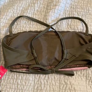 Brand new with tags. Army green, light pink and light purple stripes on top. Bando style top with removable padding. Bottoms are string tie sides. Top is D/DD. Bottom is a L.