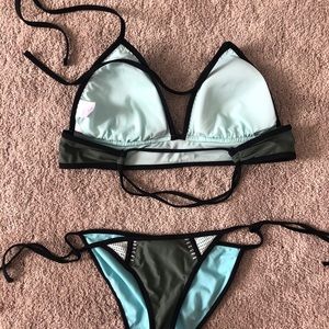 Green bikini with cute detailing! The top ties as well as the bottoms on the side. I never had a problem with the bottoms untying! The top is an XL and the bottoms are a Small. Willing to sell them separately!