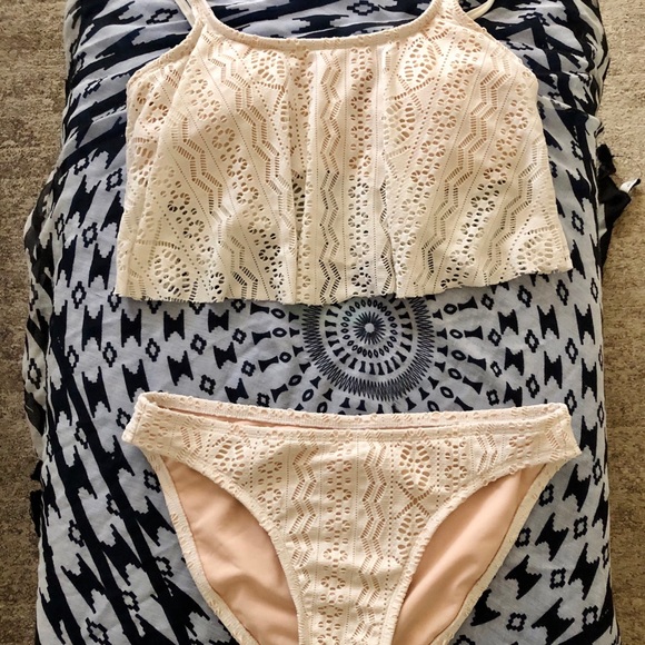 White bikini from target top is size large bottoms are medium looks very flattering on and was only worn a few times very good condition and very good quality