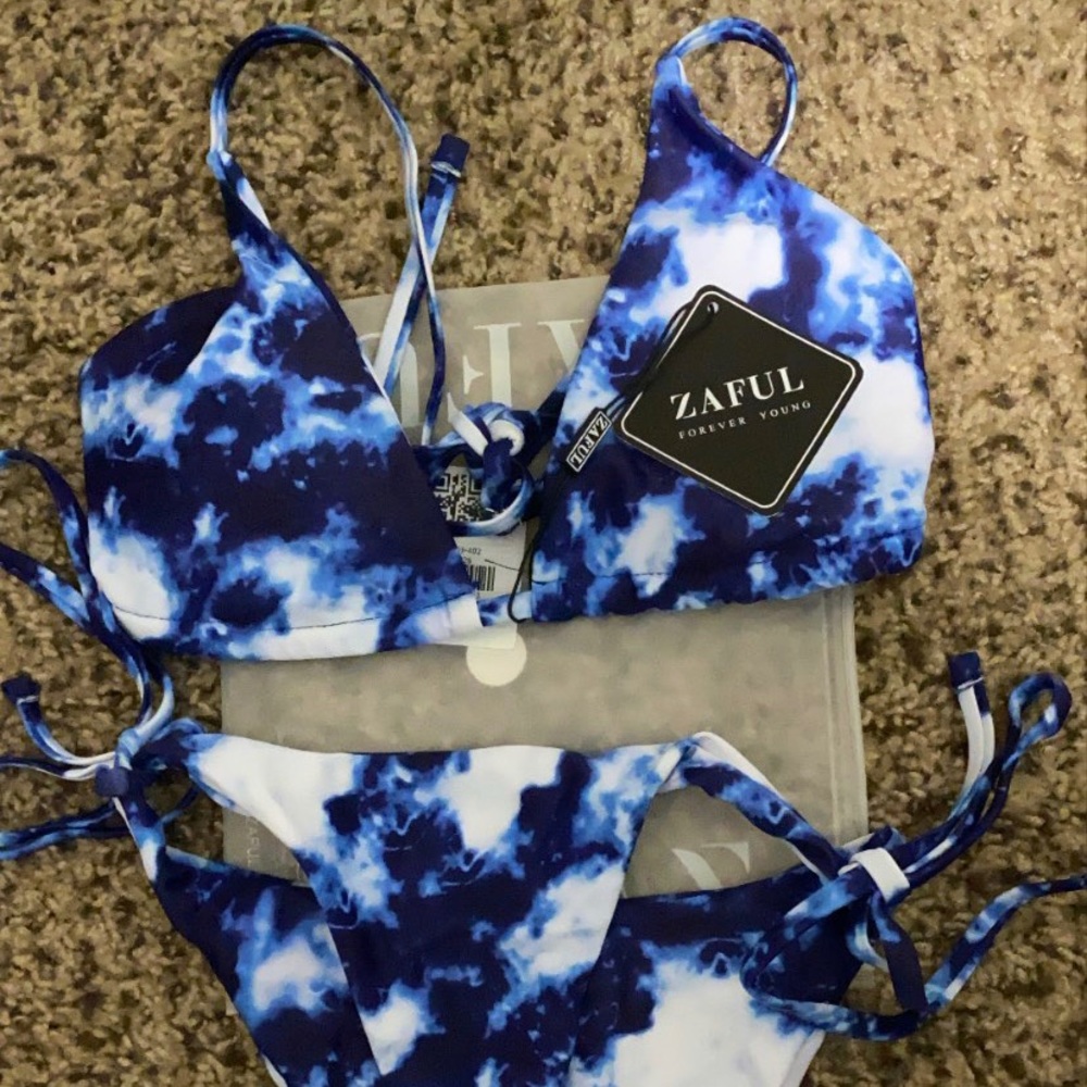 Blue and white tie die bikini. Brand new never been worn. Ties in the back and the bottoms tie on the side.