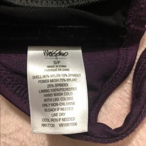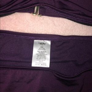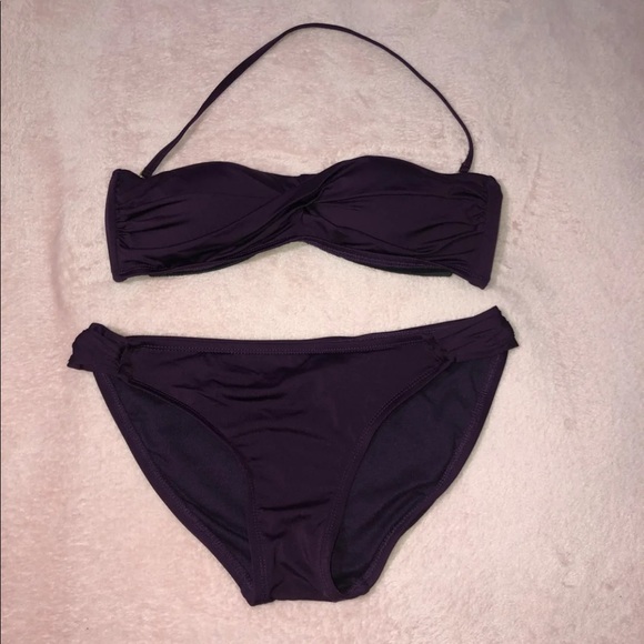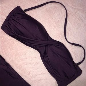 Two piece bikini. The top piece is a strapless top with a twist design, and a removable strap that allows you to go from strapless to halter.