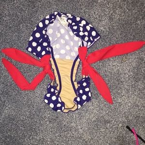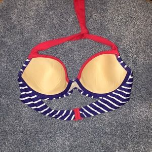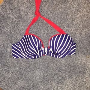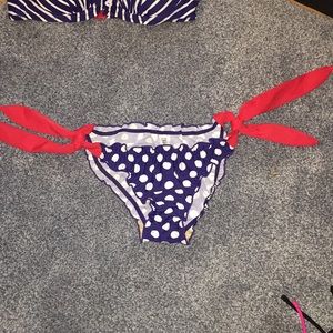 This adorable bikini POUR moi ? polkadot bottoms striped top red white and blue cute for any occasion in the summer especially the Fourth of July. Has never been worn the tags have been removed I do not have a picture of me modeling it it is a great bikini for any time