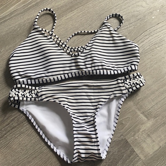 Black and white striped bikini. Small bottom medium top