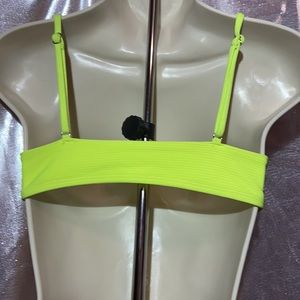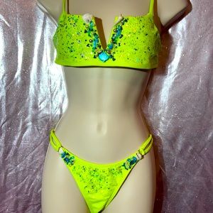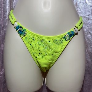 This is a brand new bikini never worn beautiful art work it’s cheeky bottoms it’s diff a head turner bright neon yellow beautiful teal art work glitter design