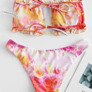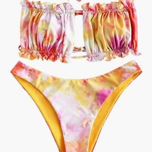 Style: Strapless Ribbed Tie back Ruffle Cutout Bandeau Bikini set