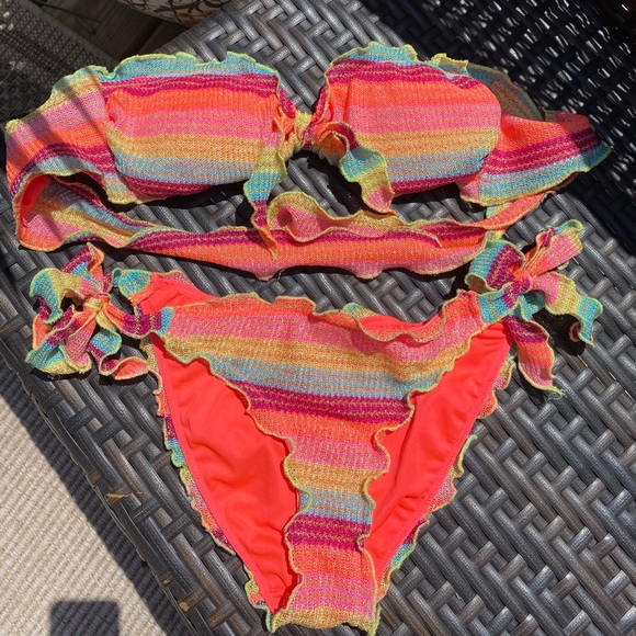 Victoria’s Secret size small strapless bikini. Both top and bottoms are adjustable.