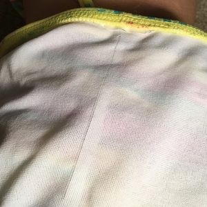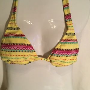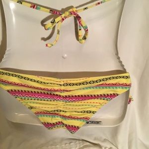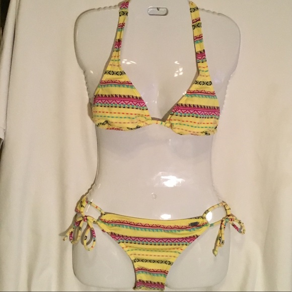 Yellow bikini. Triangle top. Ruching bottom. Brand tags cut out. Excellent used condition. No snags. All liners and padding in excellent shape. Size Medium. Bottoms have small run in inside liner.