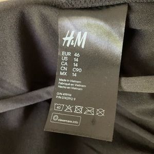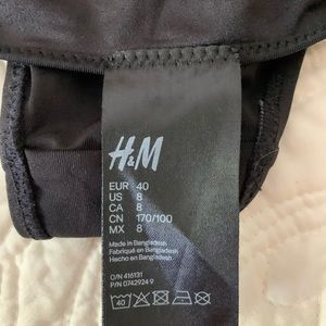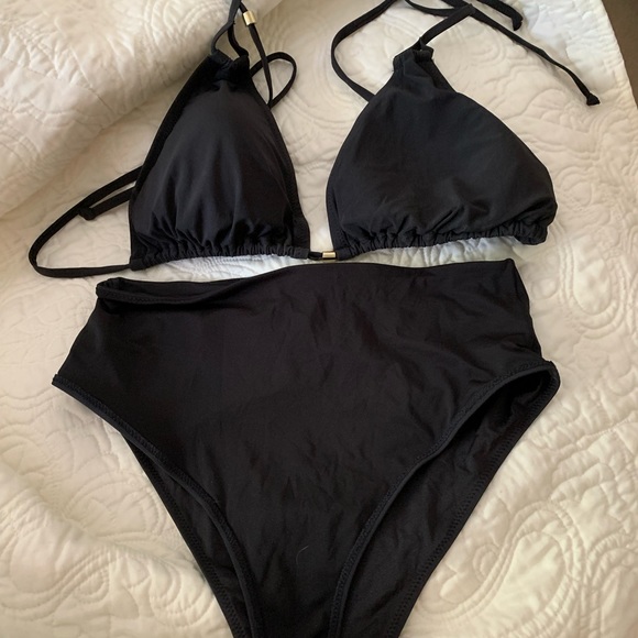 Two piece black bathing suit. Top is size 14 with tie strings at neck and back. Bottom is high waisted in size 8. Both pieces are in excellent condition