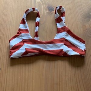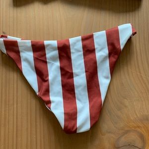 Brick orange and white striped bikini. Stretchy. 12” waist. 13” pit to pit. Non padded. Excellent new condition. Size small.