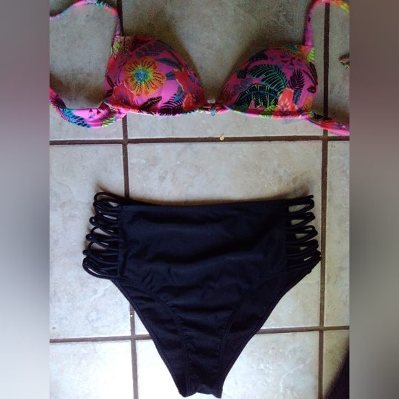 this bikini is super cute as a set, but is a mismatched one. the pink top with flowers is a Large xhilaration brand. the black bottoms are a Medium Hollister brand. would consider selling separately