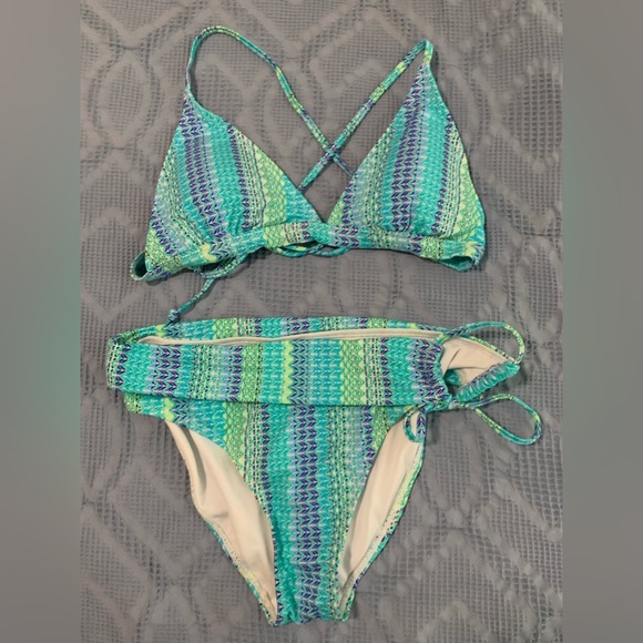 Green, blue, teal printed drawstring bikini with removable pads. Side drawstring bottoms allow for more flexibility in sizing Never worn