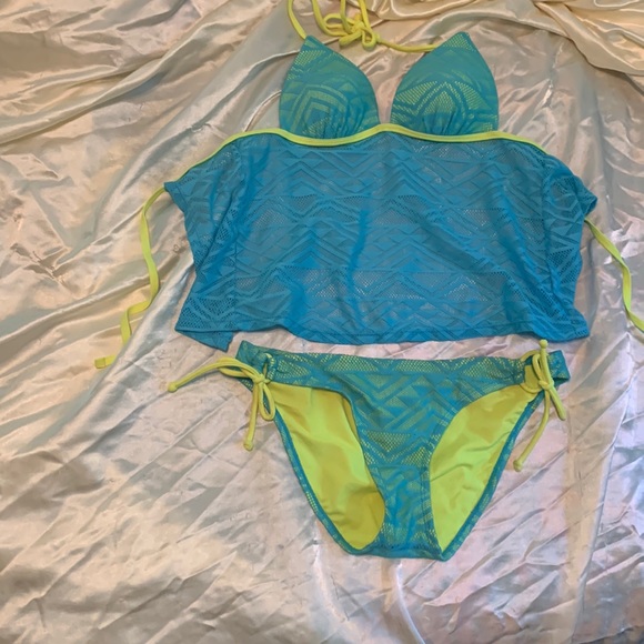 Never worn. Small top, medium bottom. Blue and lime green/neon yellow