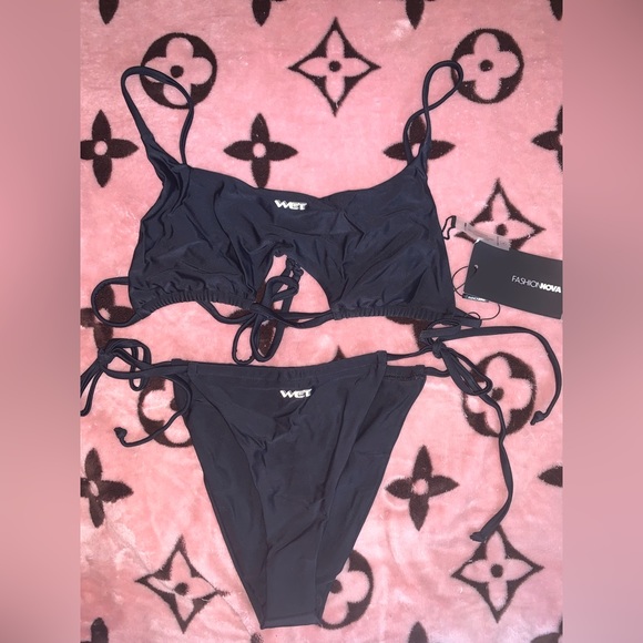 Get ready to hit the beach in style with this stunning two-piece black bikini from Fashionova. This bikini features a trendy design, with the word "Wet" printed on the front, adding a touch of sexy to your beach look. The black color adds an element of mystery and makes it easy to pair with any coverup or outfit. Ideal for anyone who wants to look great on the beach, this bikini is a must-have for your summer wardrobe.