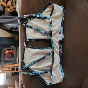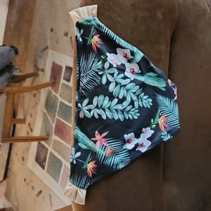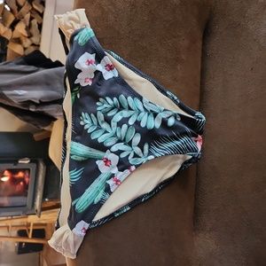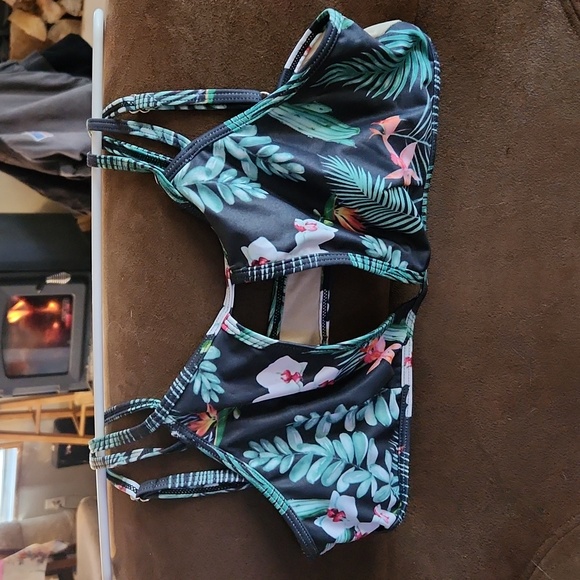this suit is new without tags. worn for pics only. very cute. bottoms are medium and top is 31 in. around with a bit of stretch.