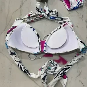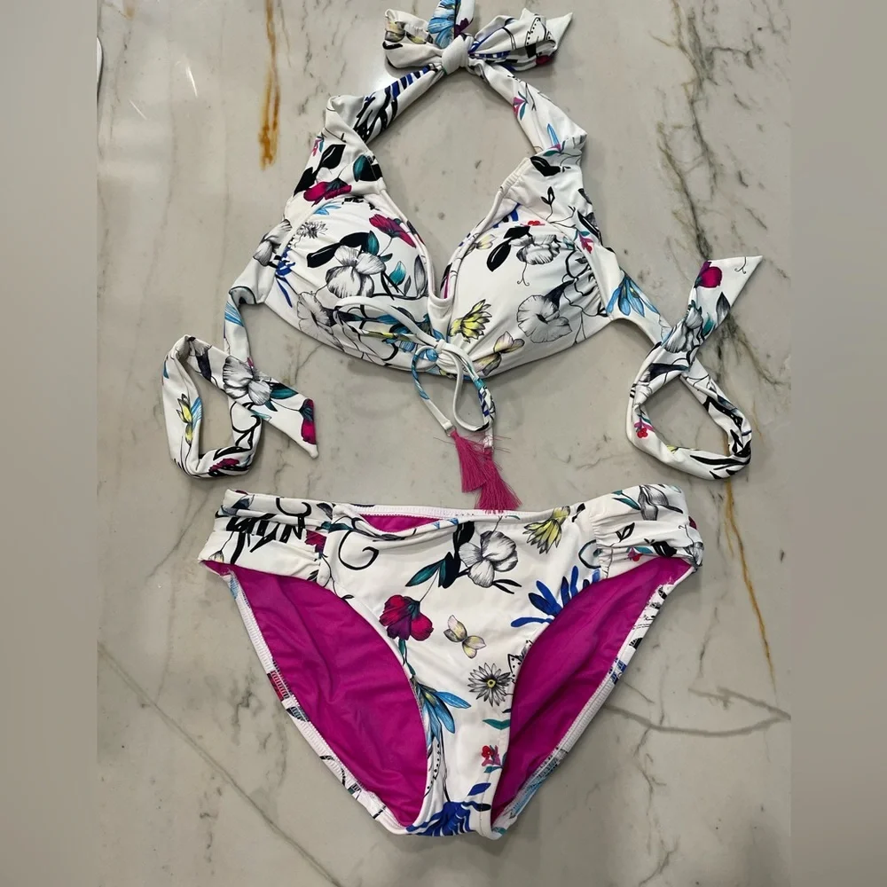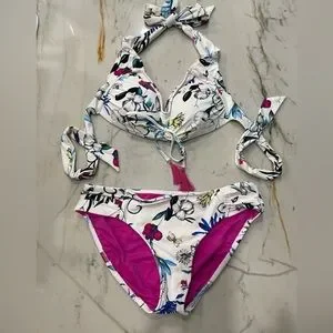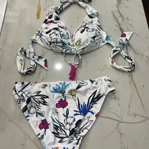 Two piece white floral print . Never worn, but tags removed Too heavily supports to give max lift (see pics) Very clean and in perfect shape Size medium Non smoking