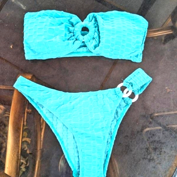 o-ring on side of bottoms and center in the bandeau top.