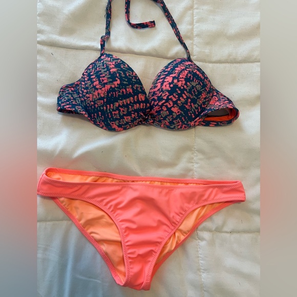 Mix match coral & blue bikini. Top is exhilaration M push up. Bottoms are S Victoria’s Secret - cheeky low rise. Can be sold separately- just message me! A little bit of unraveling on the top halter string - could easily be sewn.