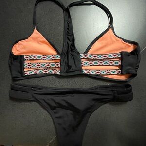 This is a super cute bikini! The top and bottom are different sizes and brands but really worked well together. Top is large but fits like a small or medium. Bottom is small and true to size.