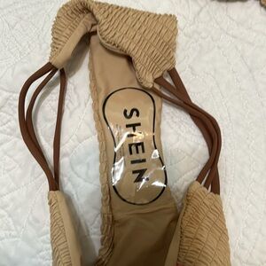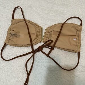 Tan and brown bikini. Brand new, only tried on the top, didn’t fit so I didn’t try on the bottoms. Size small, not a full butt bottom but not too skimpy. The top is padded which can be removed. Adjustable straps on top