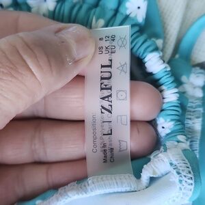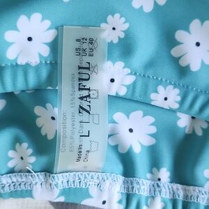 Pretty teal/green with floral print string bikini. Worn a few times. Top is adjustable in front and various options for straps in back. Very cute and fun design!