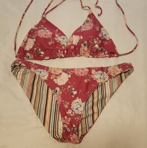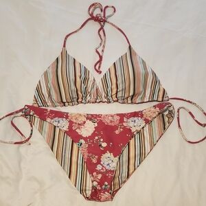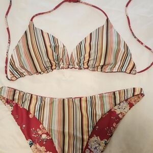 O'neill bikini mix and match set. It is in excellent condition. it is reversible, so you can wear it with the floral pattern showing or stripes or mix and match the top and bottom.
