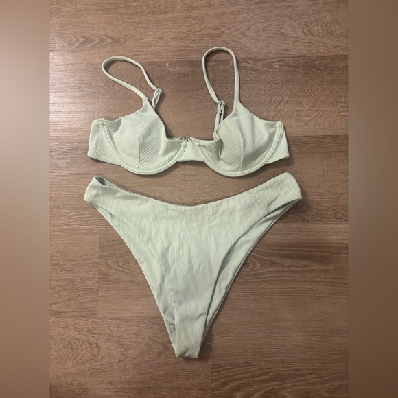 Light green bikini. Please see picture where clasp is coming loose, and can be sewed. it still latches and stays regardless.