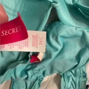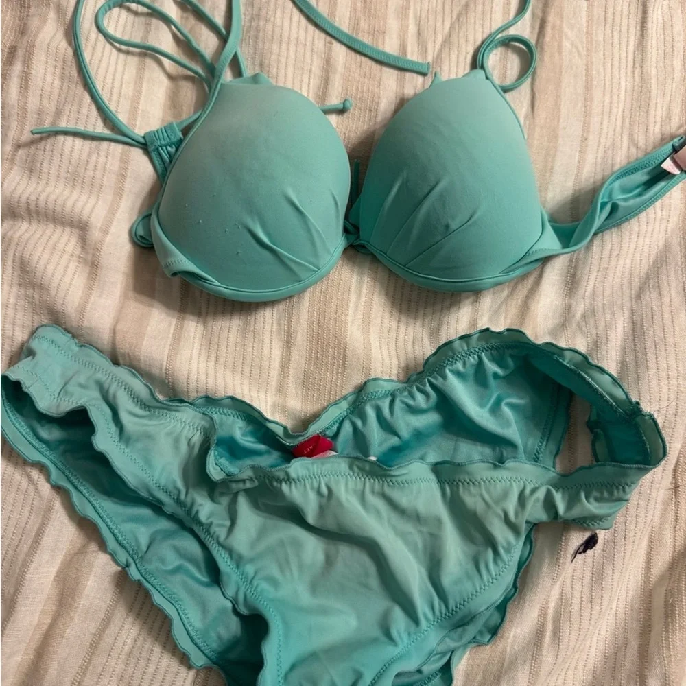 Victoria’s Secret bikini. Top has underwire. Only flaw is the pilling on the top (shown in pics) bottoms are large and top is a 34C