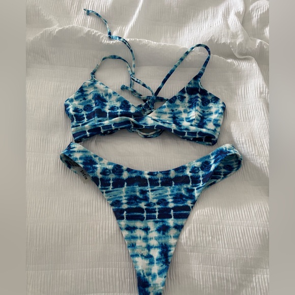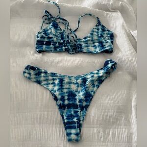 Woman’s blue and white bikini Lace up tie back Worn a few times