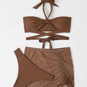 Three piece set: bikini top, beach skirt and bikini bottoms included.