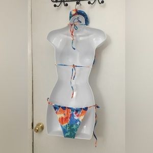 Tie Dye Bikini Swimsuit with matching Scrunchie padded halter top and tie side bottoms.