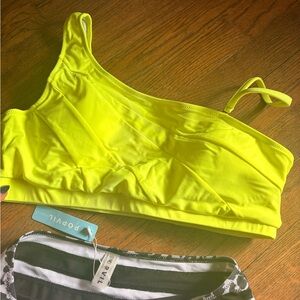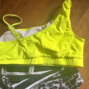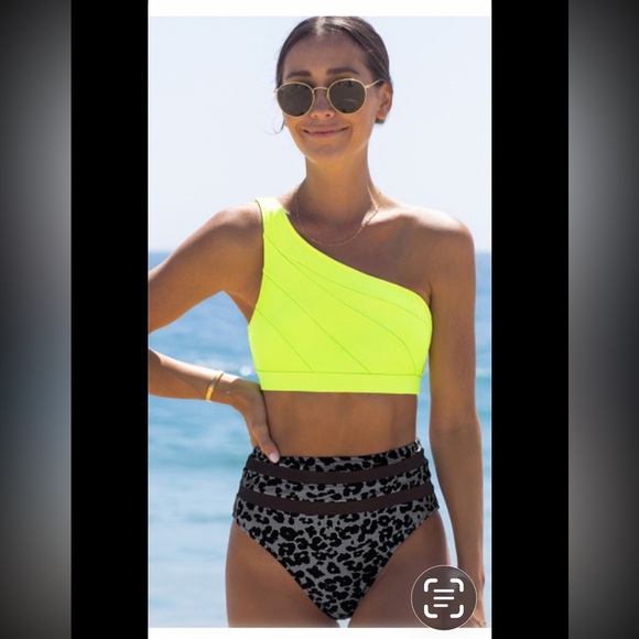 Two-piece brand new swimsuit the top comes with a removable strap. I bought the wrong size but I got in a smaller size and it’s super cute. I love it high waisted but doesn’t have your bottom hang out. The top is a large and the bottom is a medium. There’s a picture of the measurements.